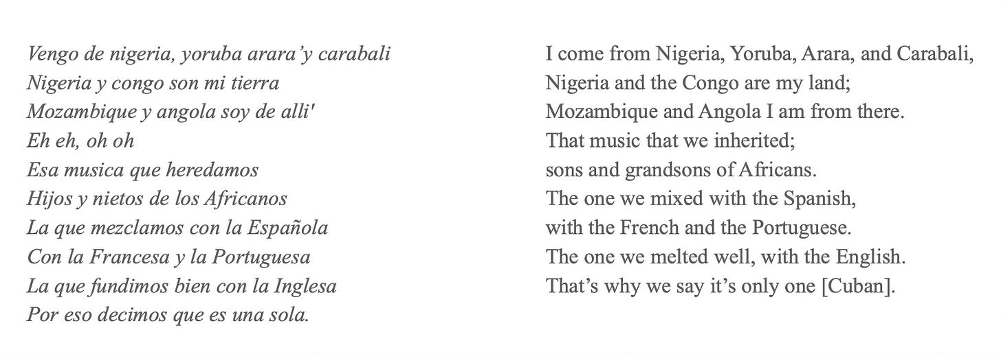 Colonialism wiped out many traditions, and because of it, colonized peoples created ways of resolviendo, or resolving cultural conflict—surviving with both the physical wounds and inherited psychic wounds. Los Van Van, a post-revolutionary Cuba-based orchestra, founded by bassist Juan Formell in 1969, explained that resolviendo is both blessing and wounding. The song titled “Eso te Pone La Cabeza Mala”—which translates to “That Messes With Your Head”—paid homage to a Cuban mixed lineage. As a musical tribute to lineage it echoes through the güiro (percussion instrument) and clave in cadence with the bell and in the rhythms of rock with swing, samba, and merengue. The lyrics12 of the song (in the original Spanish followed by author’s translation) express resolviendo: